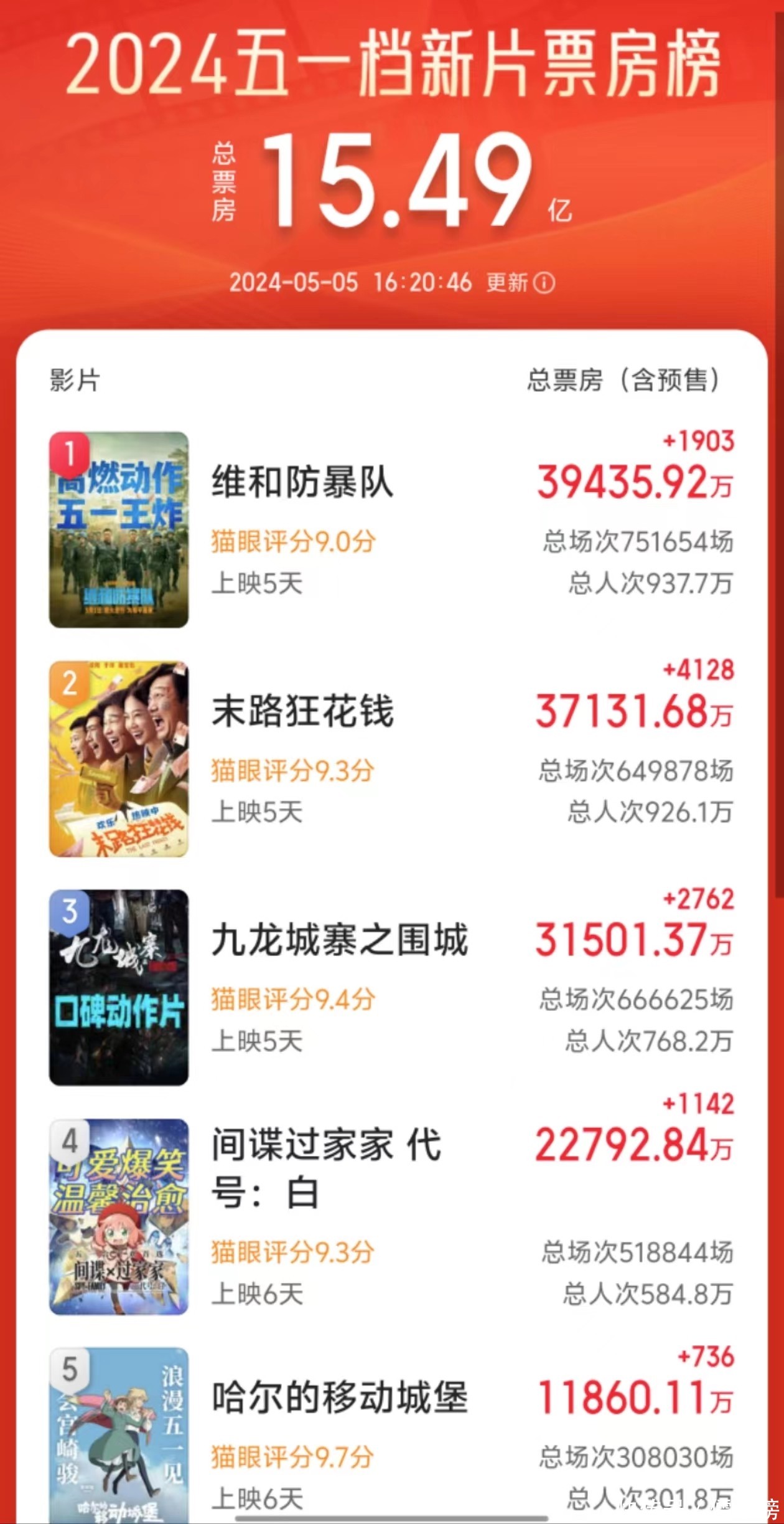 5月5日五一假期已接近尾声,而五一档新片总票房打破15亿,其中王一博、黄景瑜主演的主旋律题材作品《维和防暴队》以3.9亿的票房领跑,贾冰、谭卓主演的笑剧片《绝路狂用钱》则以3.7亿紧随自后。而五一真东说念主电影口碑最高的《九龙城寨之围城》则以3.1亿位列第三名。第四名和第五名均为动画电影,折柳是《间谍过家家 代号:白》和《哈尔的出动城堡》。