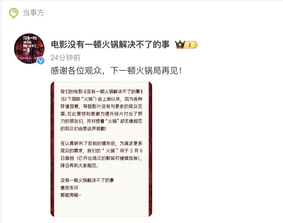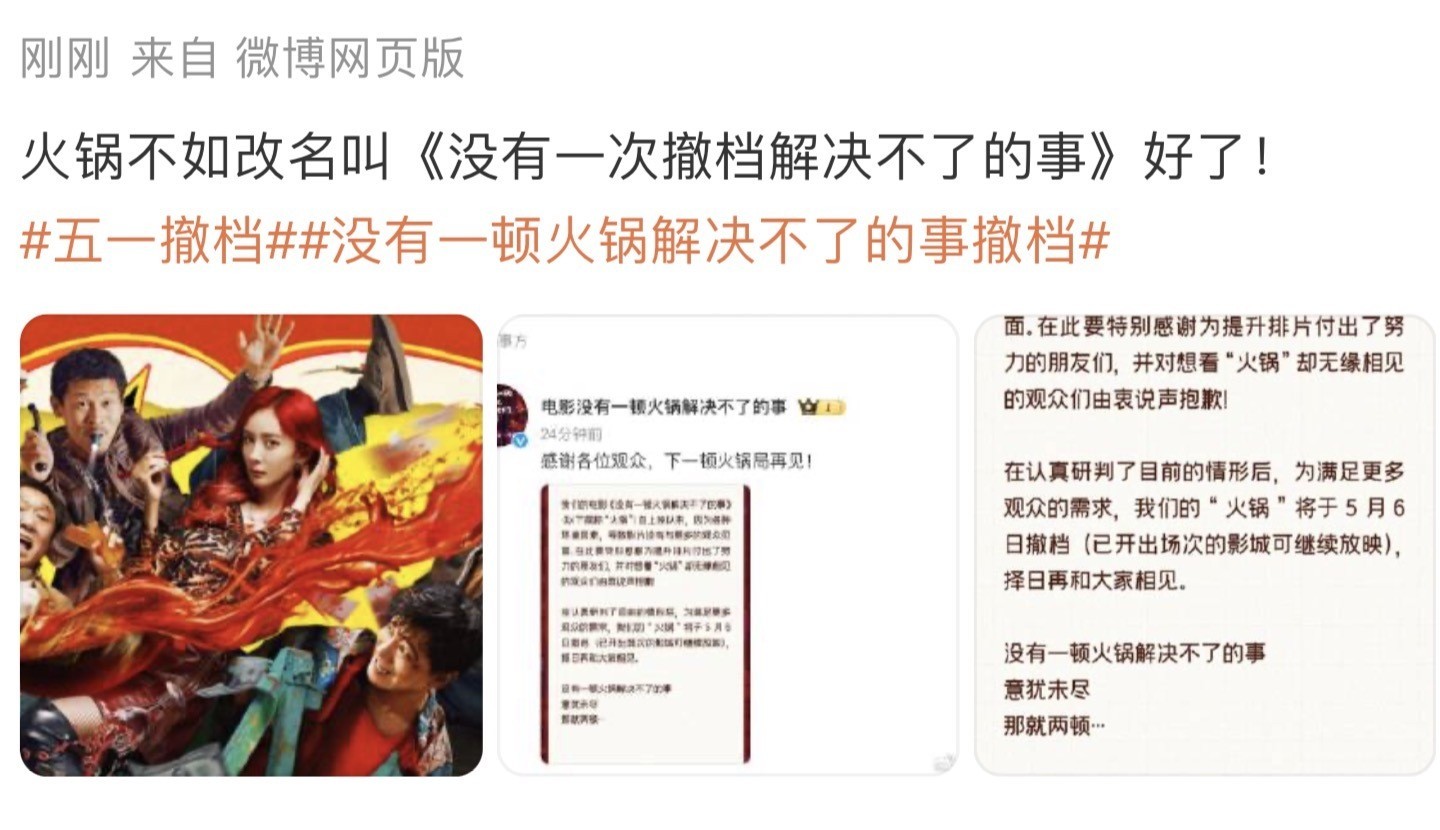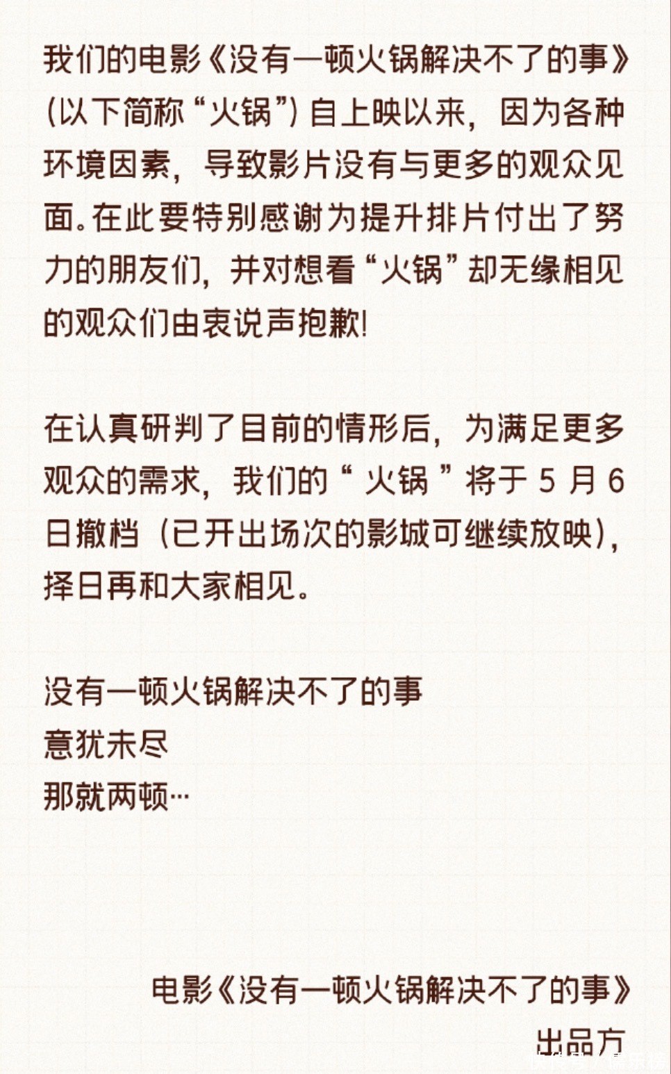 大约是见到影片的窘境,在五一假期终末一天,《莫得一顿暖锅处置不了的事》官方发布声明,称因为排片不睬想,将在5月6日撤档,择日再上映。