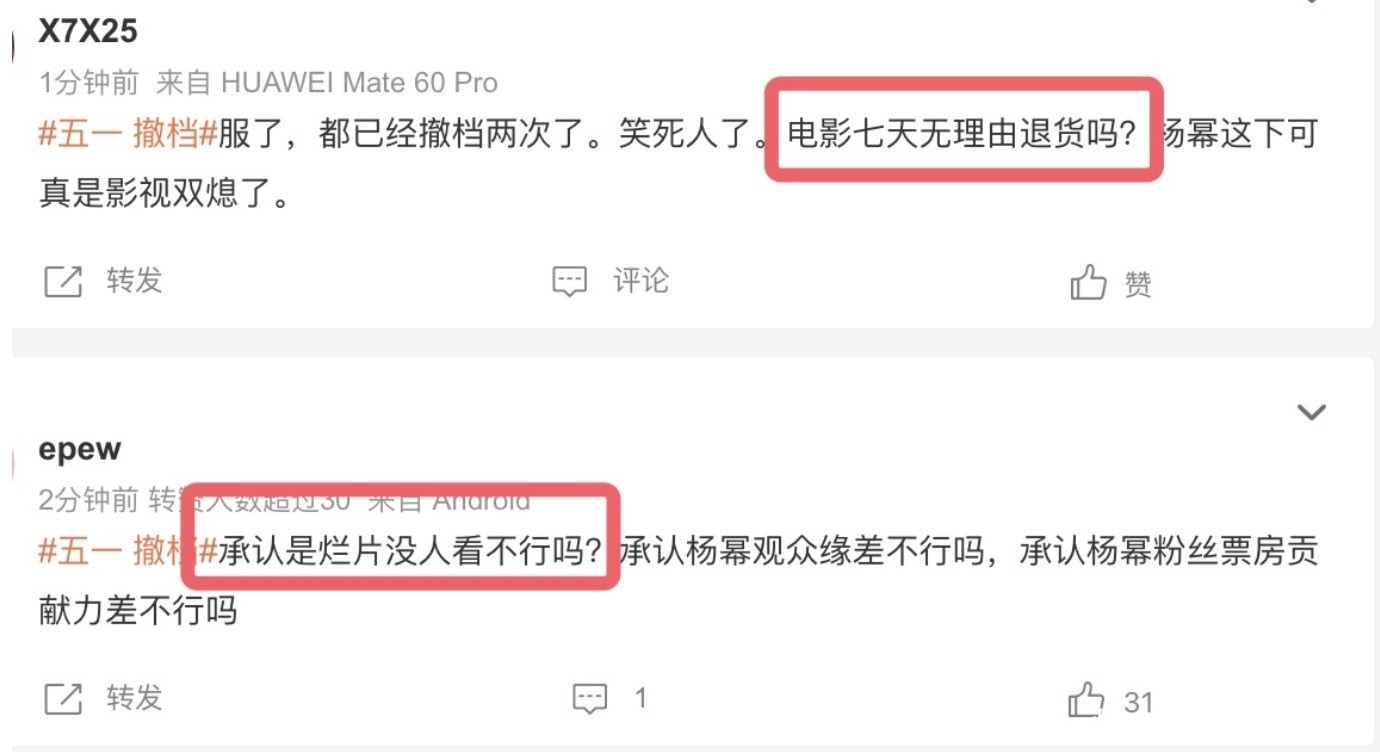 有网友则嘲讽,难说念承认我方的作品很差这样难吗。更有网友吐槽,不如这部电影更名叫《莫得一次撤档处置不了的事》,嘲讽片方的无耻,暗讽现时的电影制作方,票房不成齐怪这怪那,却从来不会从我方作品上找原因。
