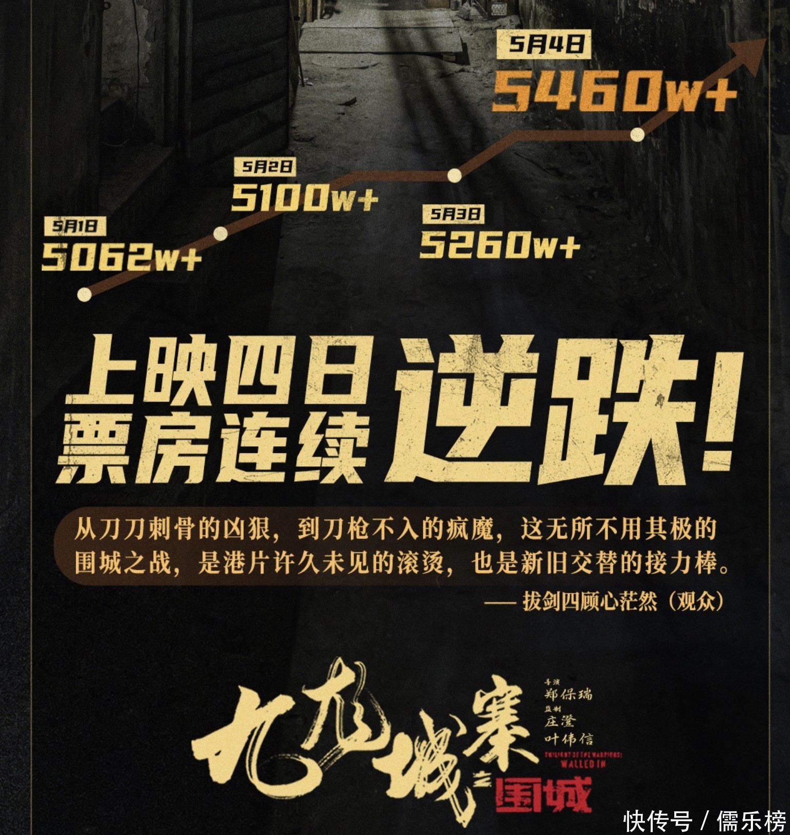 固然现时票房最高的是《维和防暴队》,可是该片的口碑并不好,反而五一档中独一的港片《九龙城寨之围城》,因为口碑发酵,依然连结4天票房逆跌,况兼上座率依然连结两天拿下冠军。因此该片很有可能反超上边那两部电影,成为五一档票房冠军。