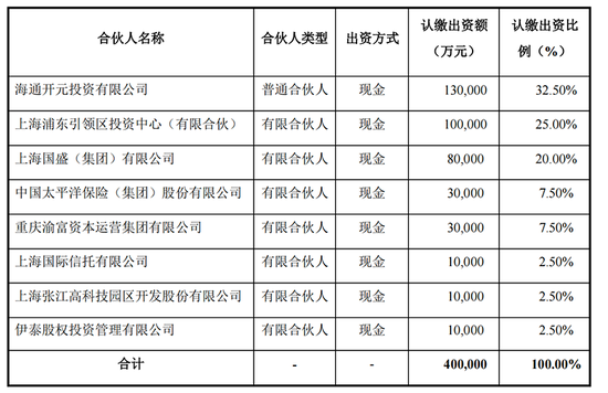 据悉,该基金的方式为有限结伙企业,认缴出资总数为40亿元,其中海通开元拟动作平凡结伙东说念主出资13亿元,出资比例为32.5%;国盛集团拟动作有限结伙东说念主出资8 亿元,出资比例为20%;中国太保拟动作有限结伙东说念主出资东说念主3亿元,出资比例为7.5%;其他有限结伙东说念主拟出资16 亿元,出资比例筹谋为40%。