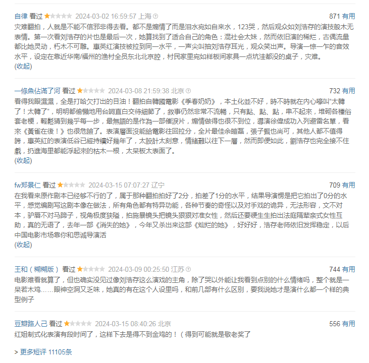 第一条指摘全方向的痛斥电影,认为《灿烂的她》是“厄运翻拍”,说刘浩存“演的稀烂”,就连惠英红皆被她拉到吞并水平,抽耳光的那场戏让不雅众笑出声。