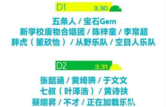 3月30日的嘉宾气势有对峙老舅、五条东谈主乐队、新学校废料齐唱团、陈梓童、李常超、胖虎(董欣怡)、从野乐队、空目东谈主乐队;